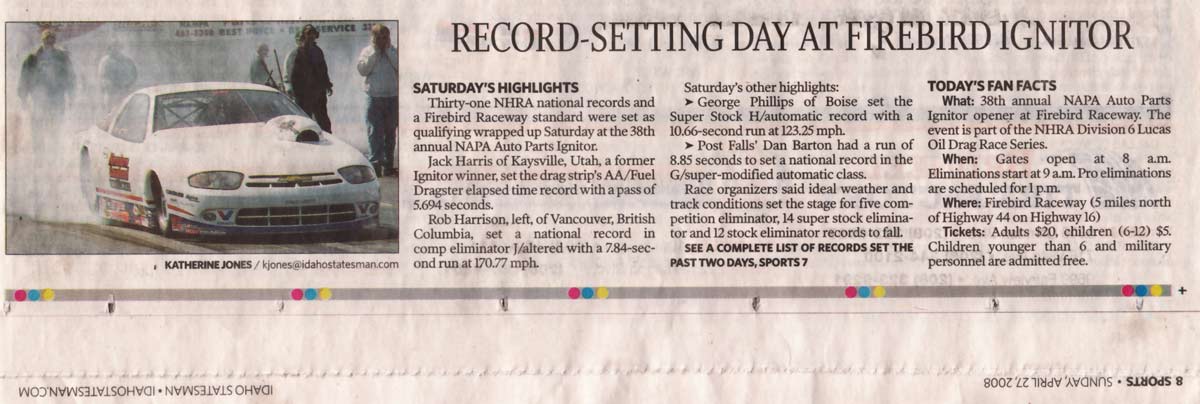 Archived News November 3rd, 2009 - Vegas is upon us and we decided not to go.....so that ends our season for 2009. We feel it was successful in most ways and we have one fast Hot rod, so it is time to get the new IGOR onto the dyno and find out what it wants. Next year will be fun and when we eliminate our mistakes, IGOR will be a happy camper, a fast happy camper. Phoenix in February can't come soon enough, keep in touch over the winter and thanks for all your support. October 8th, 2009 - It would be hard to imagine the level of abuse that we have dumped on our fans this year....first.... I want to apologize....second.....I want to try to understand how anything in this world could be so difficult. The formula is simple, build a good car , makes lots of HP.....you go fast.....WRONG....suffice to say.....we are committed July 28th, 2009 - When I think back to the Seattle National event, last year, we needed to finish off what we didn't do.....win the final. Expectations were high and our battle to calm the new power down, continued, qualified #2 and lost in round 1, due to a growing pain mistake. We will fight through this stuff, but I'm not afraid to say.....it is painful. Some years ago, I started noticing that....nothing is as it appears to be....the path to correct a problem is often the other direction, so off we go into the world of dealing with something that is "too good, "at least for now. July 13th, 2009 - It seems like it was yesterday....we set the record.....8.05@167mph......well hello....7.61@175.91...it's too much....it's in the books...Thank you everyone for your belief in us....it's all history now.... July 3rd, 2009 - Time flies....we have a problem that most would love to have...as crazy as this seems...we have too much power. New plans to manage this, are in place, but we have our hands full.....chassis set up's are new, clutch setup's are new...as good as new power is....it's a problem....a good problem, but still a problem. So where do we go from here.....directly to the fast lane....but it ain't what you think. Roger Brogdon told me 3 years ago...that this was going to be tougher than I could imagine....he is more right than i ever could understand....but it's a good thing. June 17th, 2009 - We are home from Spokane and the startling performance of IGOR jr continues. #1 qualifier (by a considerable margin) only to lose in the third round because I lifted too soon and lost by a 12 inches. Considering we could of won by 100 ft., we need to find a balance......we're working on it. Off to Seattle today, for one of the back to back races we have this year. We are just scratching the surface with this new problem called I J, he is showing us a path of power that defy's belief and the RPM rate, is in another zone....the ozone. June 8th, 2009 - The new IGOR he cometh......he's here....and he's got an attitude....see you in Spokane. May 26, 2009 - IJ (pronounced eye jay} for IGOR JR. debuted himself with a win at his home track, Mission. IGOR (the old man) won last year and he was resting under the bench in the trailer while he proudly watched his son rev up. IJ was cranky and fought off his debut until the last minute, when a 13 day problem was found by our new Hero, Pat. Pat crews for IGOR and he found the problem on Sat. night......from the #16 spot in qualifying (of 16 cars) we worked our way through the field to win from the back door, so to speak. I don't know what the recipe for winning is (if there is one) but you definitely don't want this one. We're off to Spokane on June 12th and this will be the 1st NHRA race at this facility and we are told that it is 1st class. The start to our season was a little late, but it got on the right track (pardon the pun) so we'll keep the ball rolling. IJ is rather revvy, I think the best is yet to come......stay tuned.... May 20, 2009 - It was not unlike the cry of a new born, Saturday, May 9th, 2009 @ 8.16 pm , the sound of Son of IGOR could be heard, slowly, carefully, the throttle was applied and the new sound left a puzzled look on everyone's face. A minimal amount of throttle applied, sent the rpm up at a rate we have never seen and the shift light flashed, Son of IGOR has an attitude. We have spent the last week sorting out new motor bugs (mostly computer related, what else is new) but suffice to say we will be putting it into the trailer and heading for Mission on Wednesday ( I was beginning to think I'd never say that). We'll run the test and tune on Thursday , to get the cob webs out, and we hope to see everyone over the weekend. Last year there was quite a large group of friends and customers that made the trip to the track, but I failed to post the times and the days we were there , (and I heard about it from everyone else that would of been there)......so here goes, Friday, May 22nd, 2 rounds of Comp qualifying, Saturday May 23rd, 2 rounds of qualifying and Sunday May 24th, final eliminations start at 11 am. Come by and say hello, the hospitality cooler will be full and Son of IGOR wants to say Hi. if you can't find our trailer, listen for that strange noise and walk towards it, approach with caution, he's got an attitude. April 25, 2009 - I'm happy I qualified the possibility of getting to the dyno and to Boise on time......NOT. We are fighting thru the complications that continue to delay the introduction of Son of IGOR. Monday last we decided to not go back and put IGOR in and go to Boise. The new IGOR is going to get finished, and then we will set a plan in place. Sorry for the lack of accomplishment, but it has been a monumental battle....i will promise some good results when we finish this, but for now you will have to bear with us. Every day gets us closer....i'm sure it will be worth the wait......Mission , May 23....BE THERE! April 12, 2009 - OK, here it is, Mission has rained out each weekend in April, we will be making noise in the garage, then onto the dyno, then back into the car and head for Mission to te